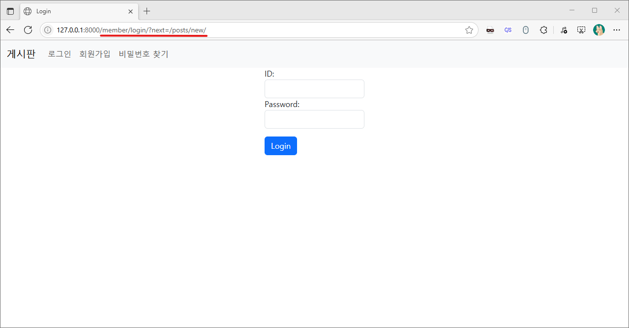 이는 로그인이 완료되면 next의 값 (/posts/new/)로 이동시켜 주겠다는 뜻입니다.