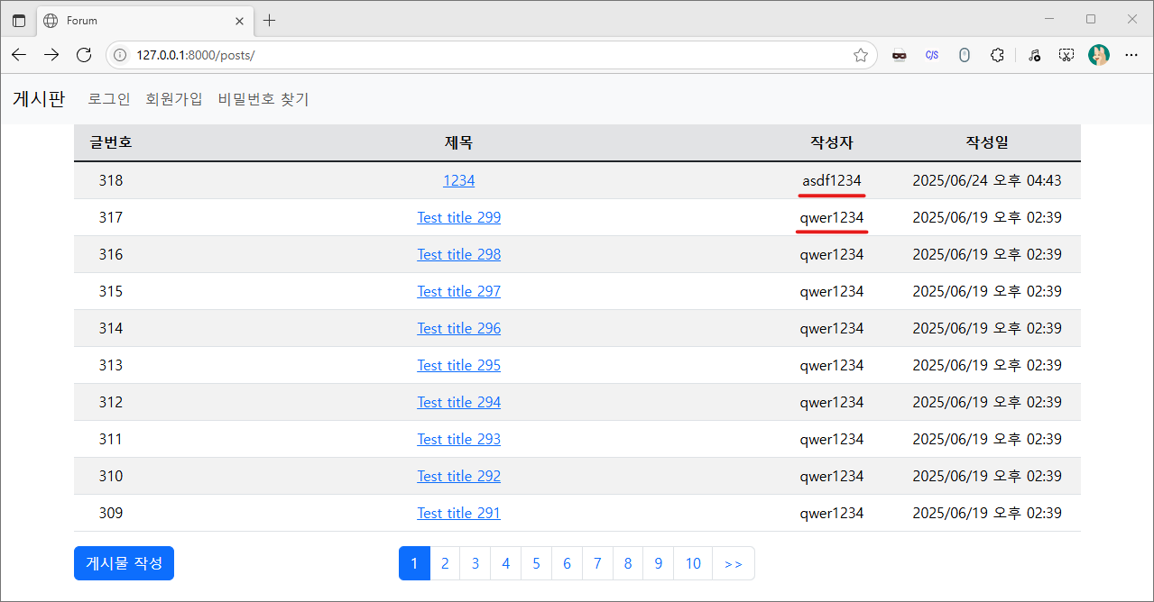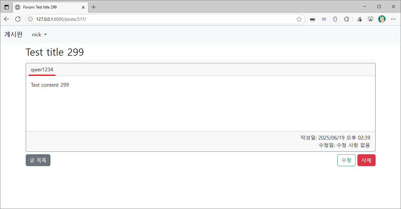 기존 포스트들의 작성자로 등록한 사용자가 아닌 다른 사용자 계정으로 접속하여 게시물을 작성해 봅시다.