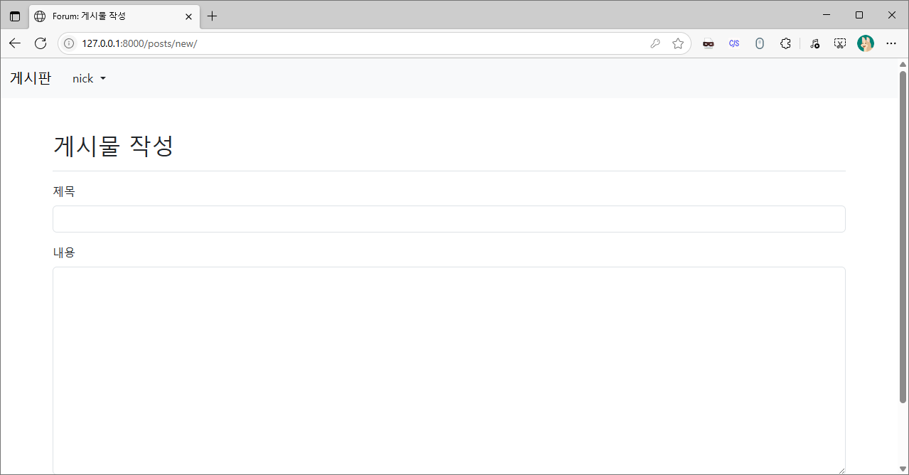 로그인을 완료되면 자동으로 위 스크린샷처럼 이전에 요청했던 페이지{게시물 작성 (/posts/new/)}로 이동됩니다.