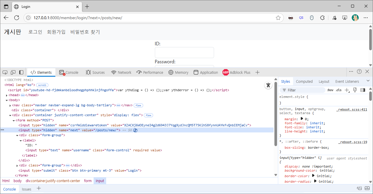 위의 코드와 스크린샷을 참고하면 csrf토큰과 같이 hidden 타입의 next라는 name을 가지는 input태그를 확인하실 수 있습니다.