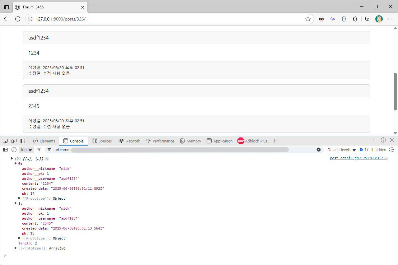 여기서 문제가 하나 생깁니다. 지금까지는 템플릿 태그 (|date:"Y/m/d h:i")를 통해 날짜 형식을 보기좋게 변경했습니다. 그러나 이제는 JSON 문자열로 받아와 자바스크립트 내에서 템플릿 태그의 사용 없이 처리해야 하는데 날짜의 형식이 "2025-06-26T08:12:18.912Z" 형태의 ISO 8601 형식으로 반환됩니다.