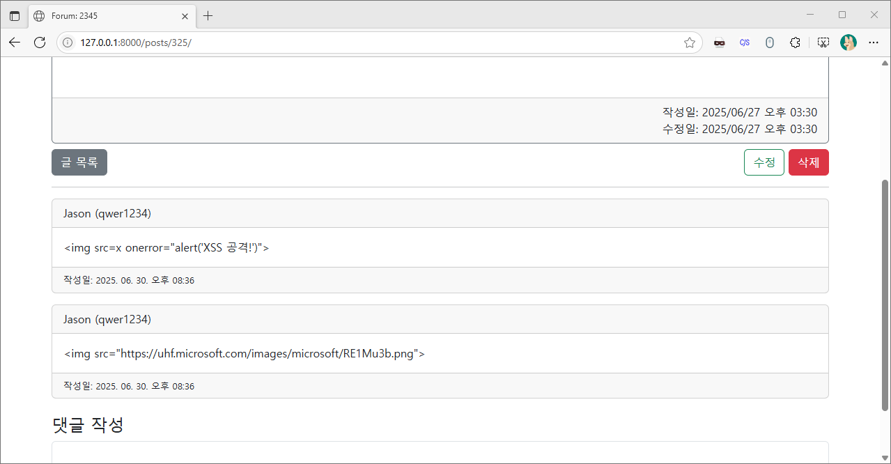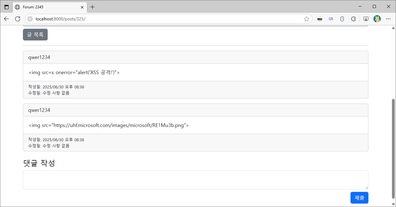 일반적인 텍스트 content에서는 정상작동을 하는 모습을 보여줍니다. 다만 게시판 이용자가 아래와 같은 댓글을 작성했다면?