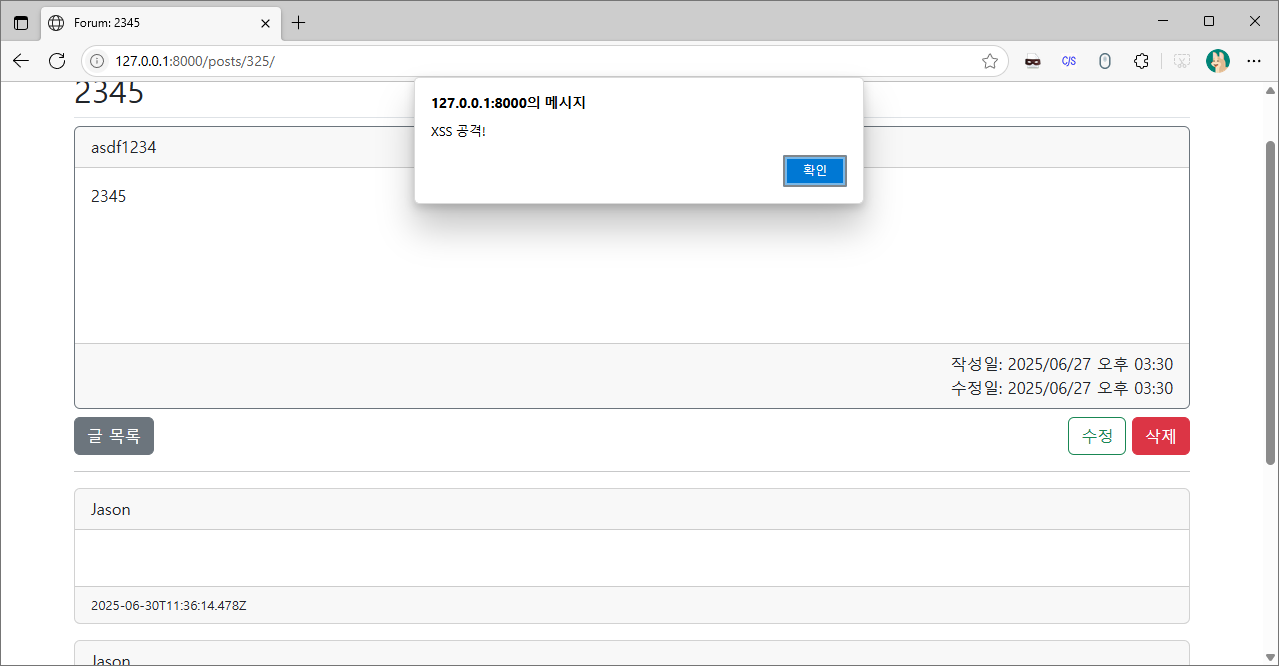 innerHTML을 사용하였는데 XSS공격이 작동하지 않습니다. Django 템플릿 엔진은 자동 이스케이프를 지원하기 때문입니다.