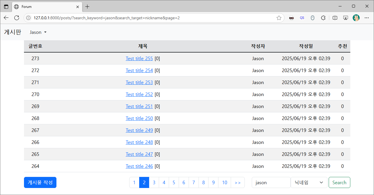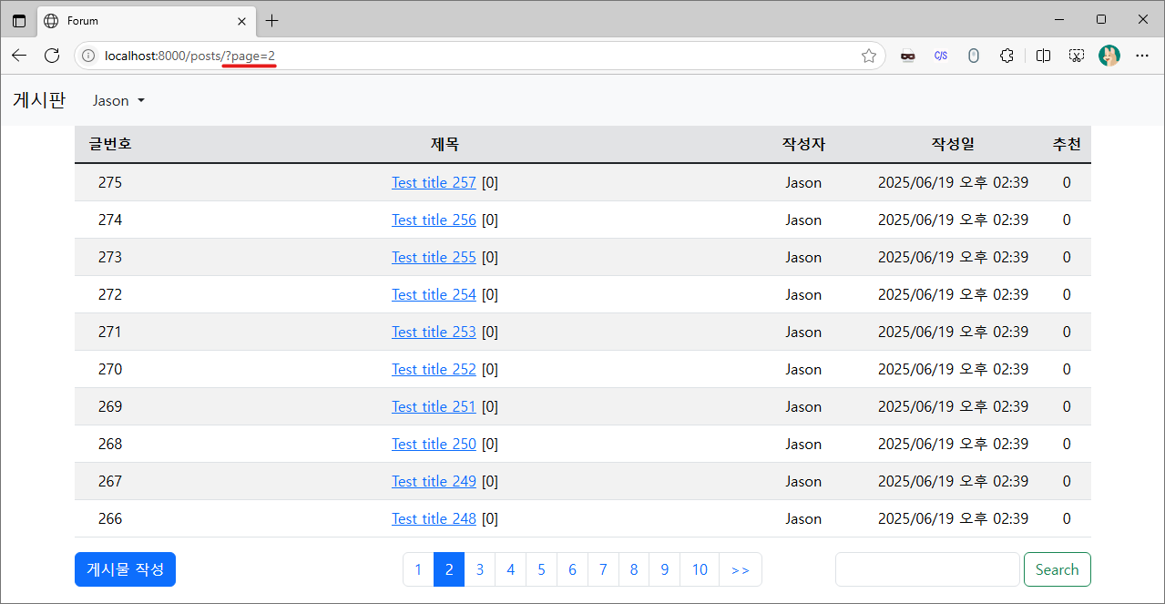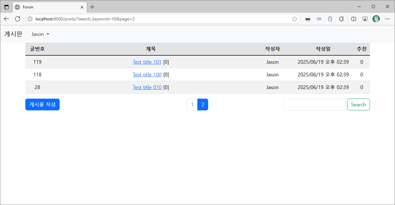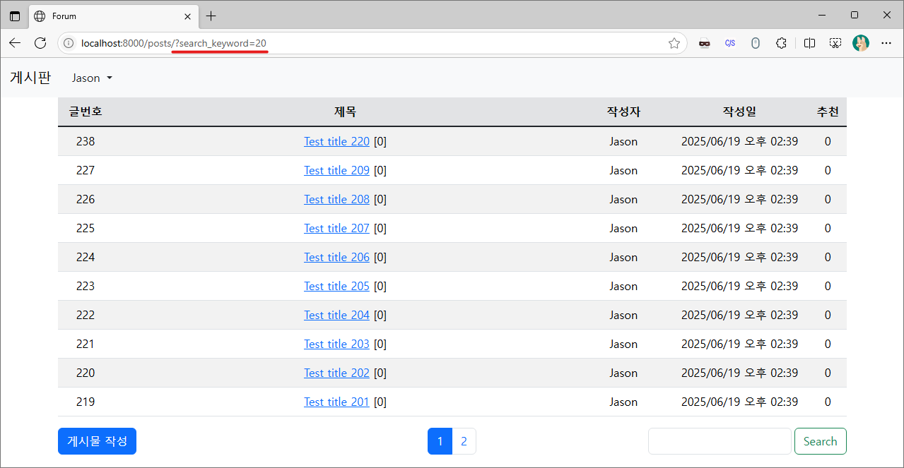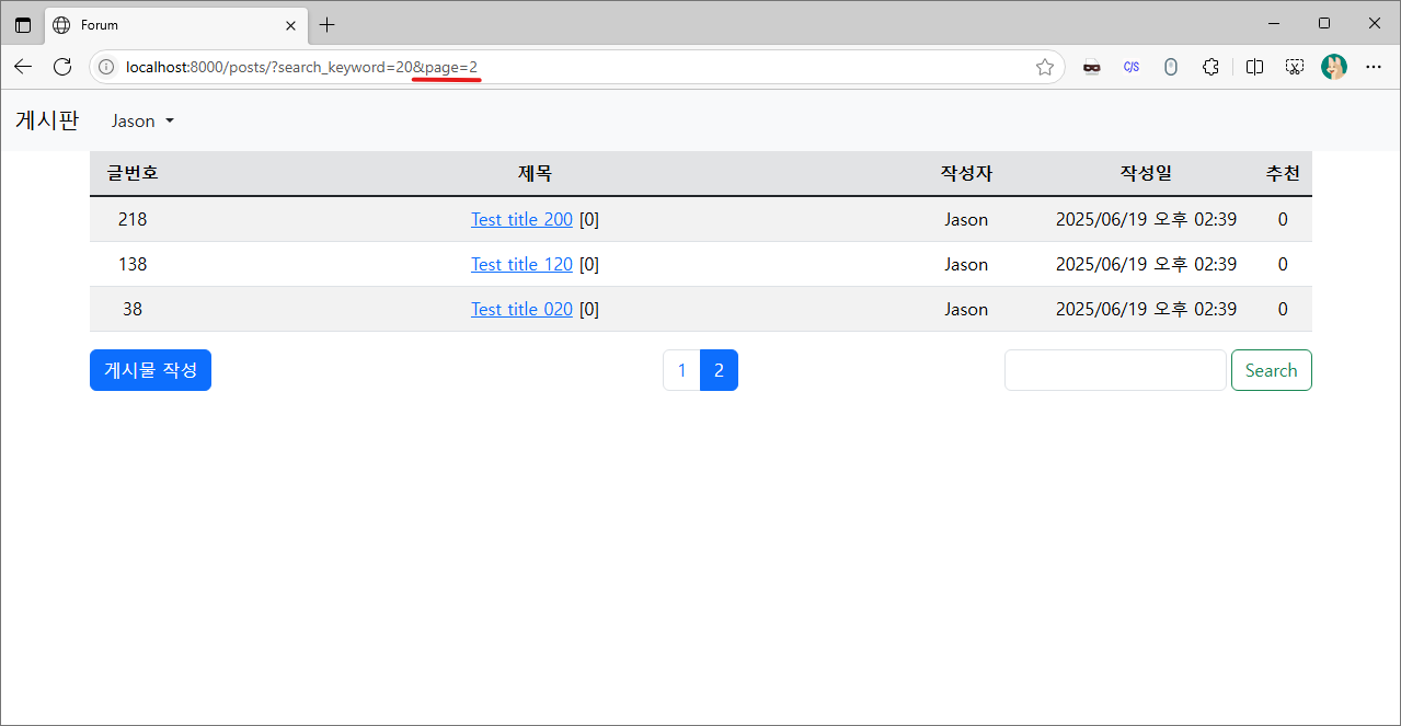 그리고 위의 코드로 변경하여 페이징과 검색기능이 동시에 작동하는지 확인해 봅시다.