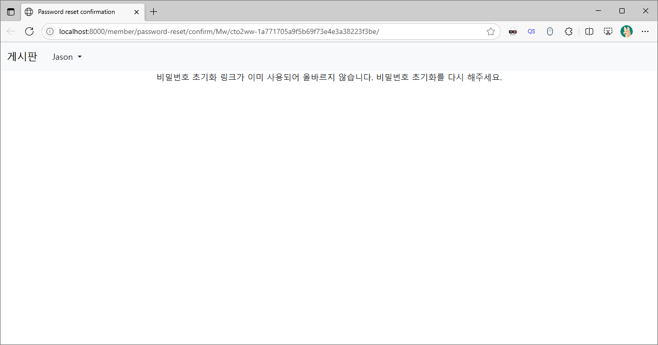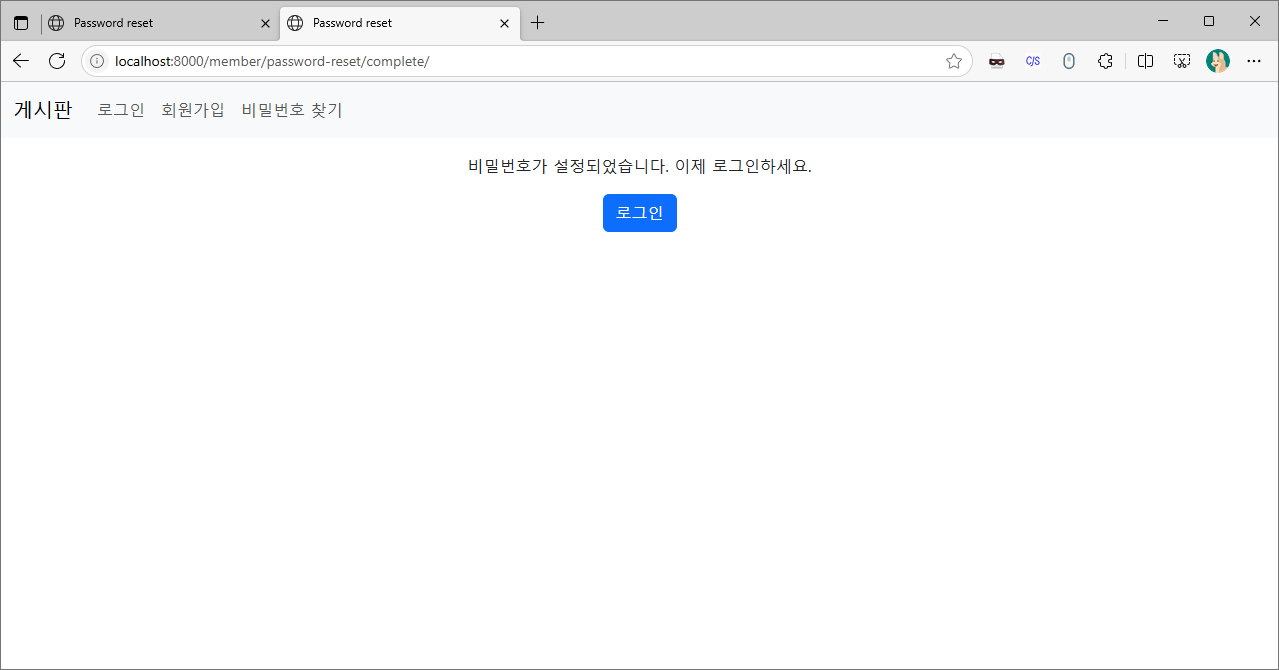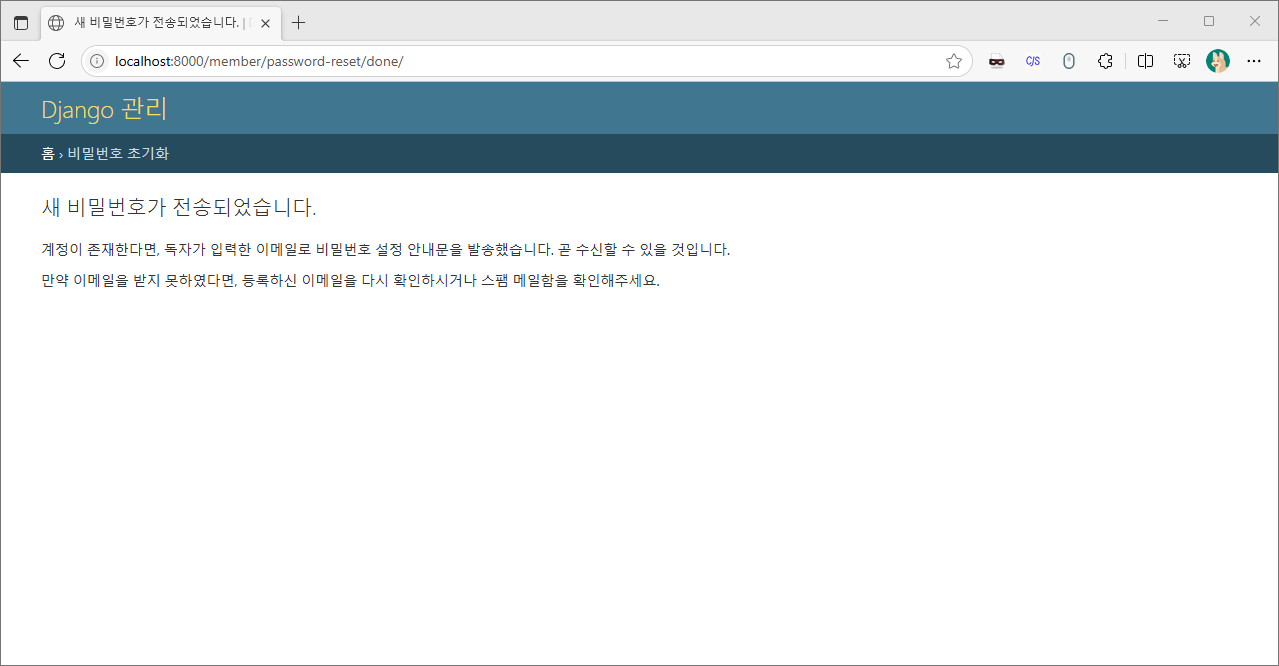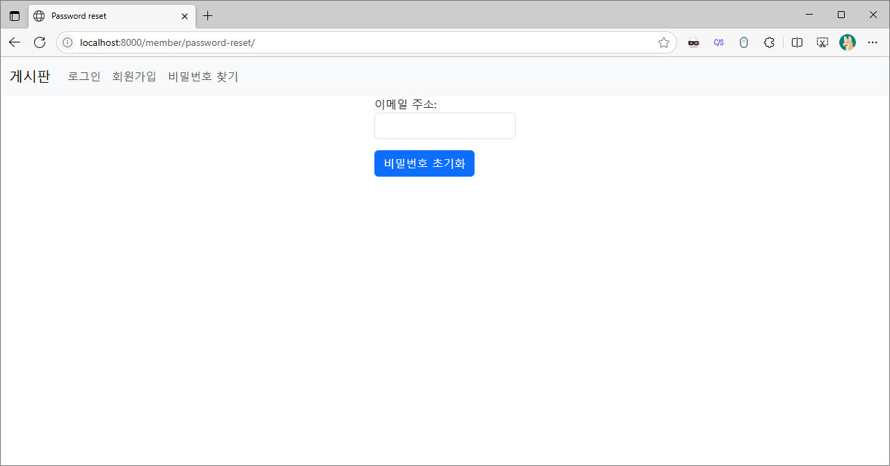 로그아웃과 마찬가지로 url 라우팅 만으로 설정할 수 있습니다. 한번 라우팅한 /member/password-reset/으로 접속해 봅시다.