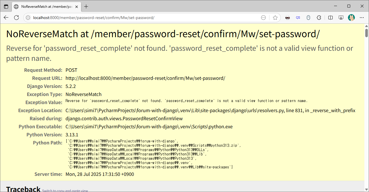 또다른 오류가 우리를 맞이해 줍니다. 이번에도 NoReverseMath 에러가 발생하는데요. 이번엔 password_reset_done을 찾을 수 없다고 알려줍니다.