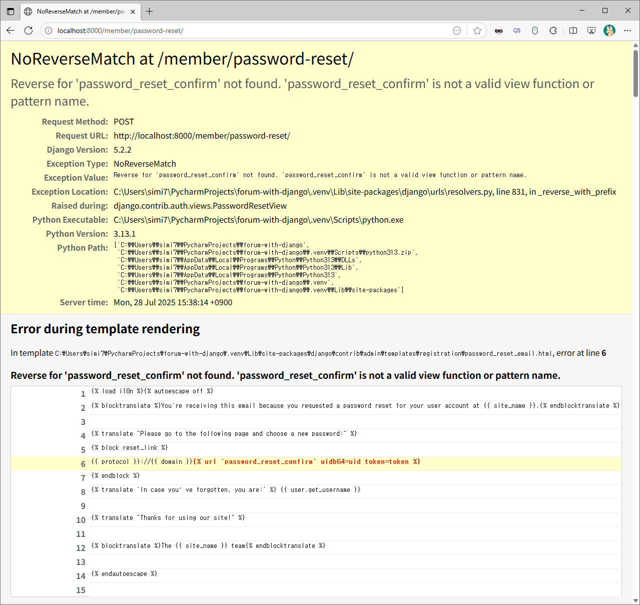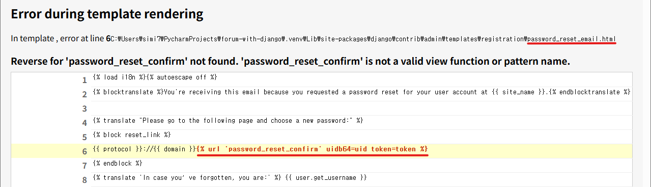 위와 같은 에러가 발생하게 됩니다. 읽어보면 템플릿을 렌더링 하는 도중 password_reset_confirm을 찾을 수 없다고 하는데요.