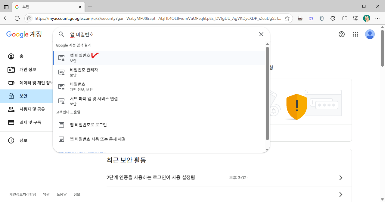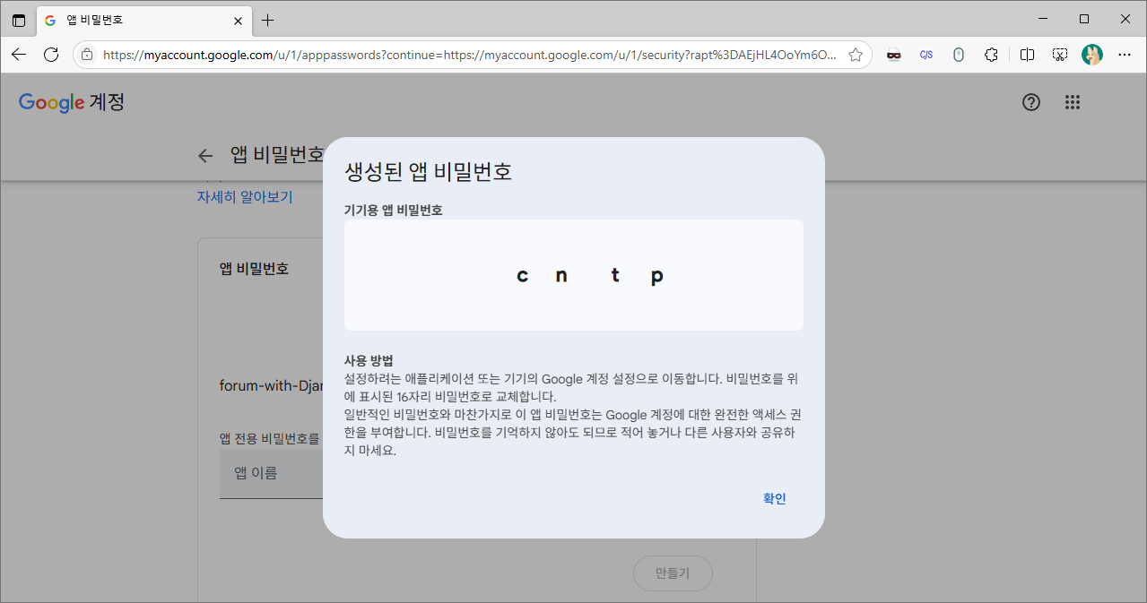 위의 사항들을 따라 16자리 비밀번호를 발급받습니다.