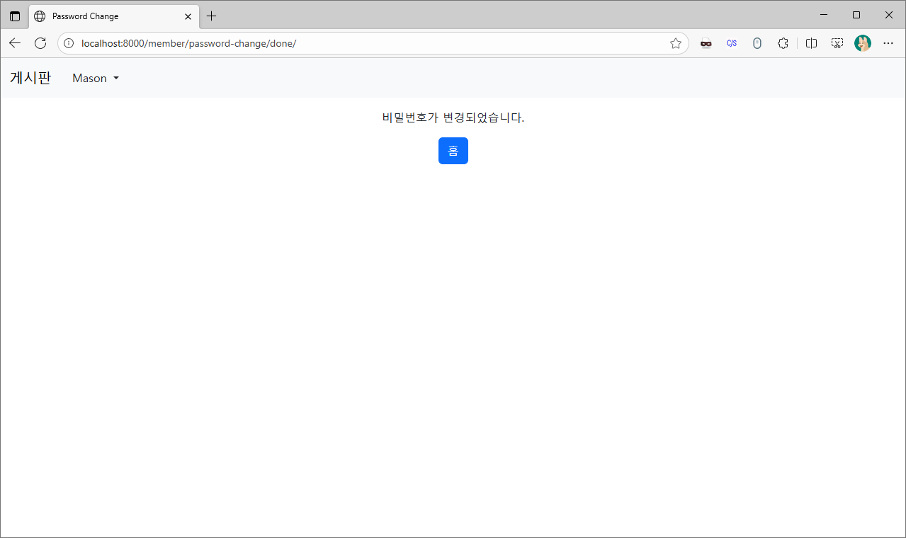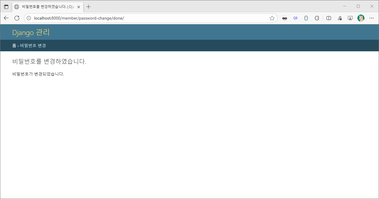 success_url을 통해 완료 창을 보여주는 뷰가 연결되지 않았을 뿐 비밀번호 변경 요청은 정상처리 됩니다.