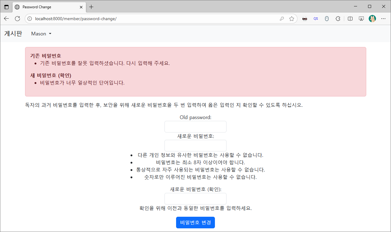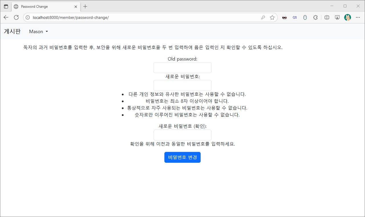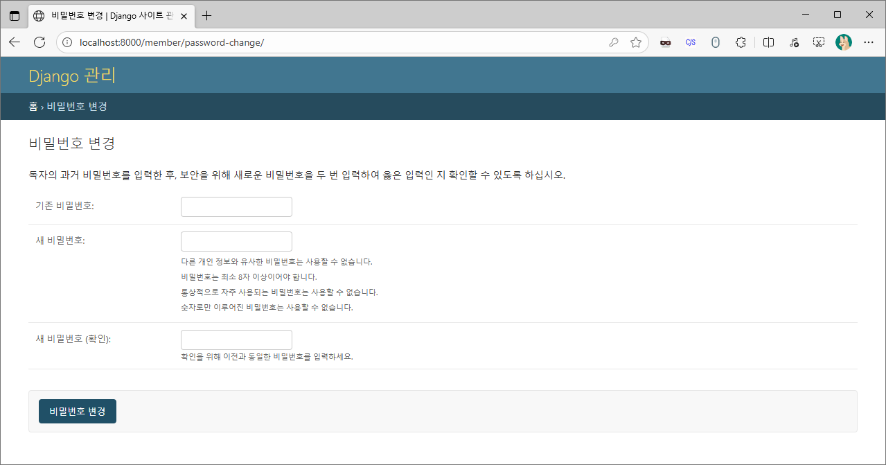 먼저 장고에서 기본으로 제공되는 비밀번호 변경 템플릿을 사용해본 뒤, 커스텀 템플릿을 작성해 봅시다.