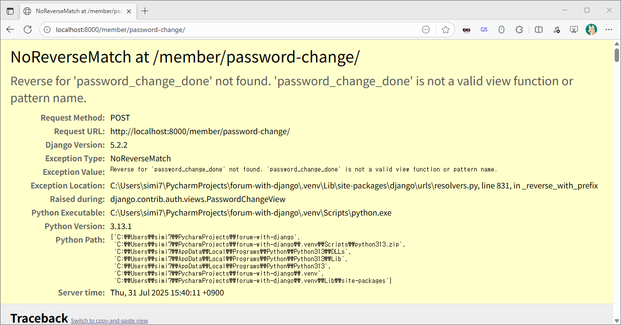 password-reset때와 같은 에러가 발생합니다. success_url 매개변수를 작성해 줍시다.