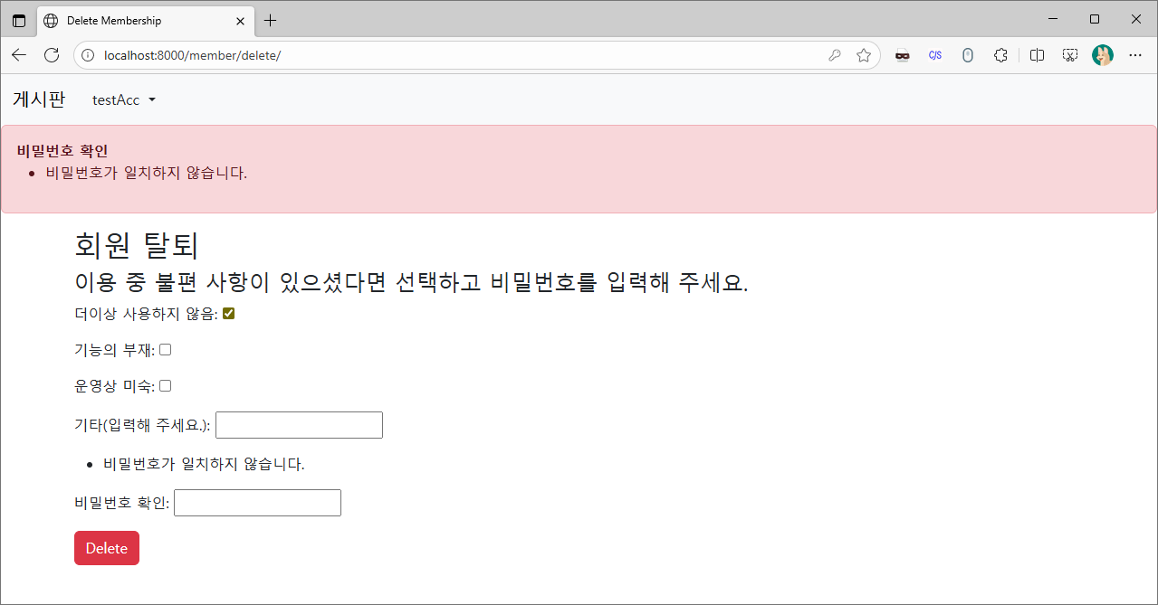 회원탈퇴 뷰는 구현이 간단하기 때문에 auth_view에 작성되어 있지 않습니다. 직접 구현해 봅시다.