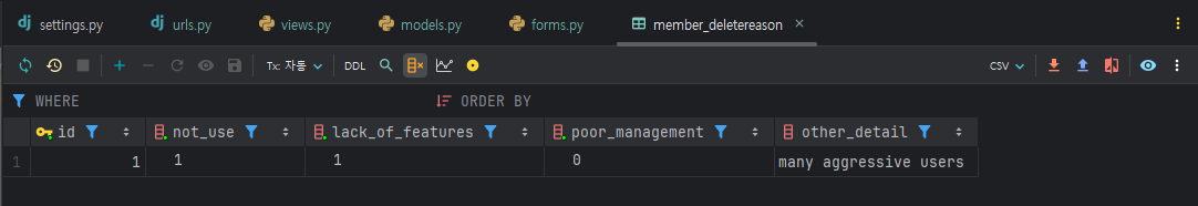 먼저 회원 탈퇴 시 이유를 묻고 그 데이터를 저장하는 모델을 생성해 봅시다.