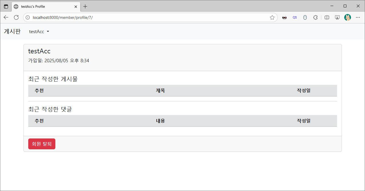로그인한 사용자의 프로필 페이지라면 회원탈퇴 버튼을 출력합니다.